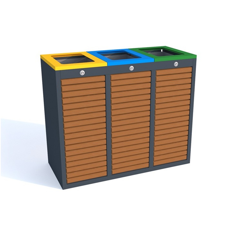 Stacja Segregacji Odpadów ETINO 3x60l z drewnianymi listwami to idealne rozwiązanie dla osób, które cenią porządek i wygodę. Wysokiej jakości kosz do segregacji śmieci 3 komorowy. Wersje kolorystyczne: Kolorystyka poszczególnych pojemników dobrana jest wg standardów określonych przez Ministerstwo Środowiska.