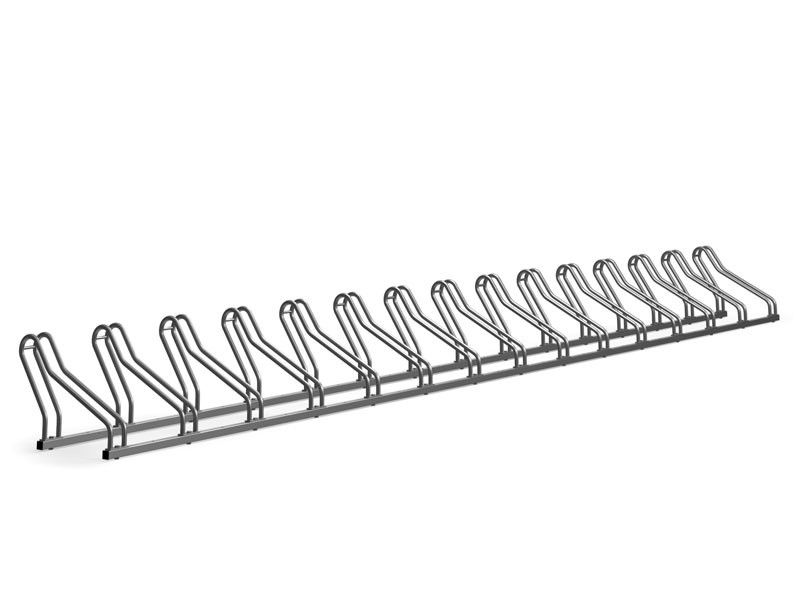 Stojak rowerowy ROSI 15 z dwunastoma stanowiskami. Przeznaczony do parkowania wszystkich typów i wielkości rowerów również tych wyposażonych w hamulce tarczowe.